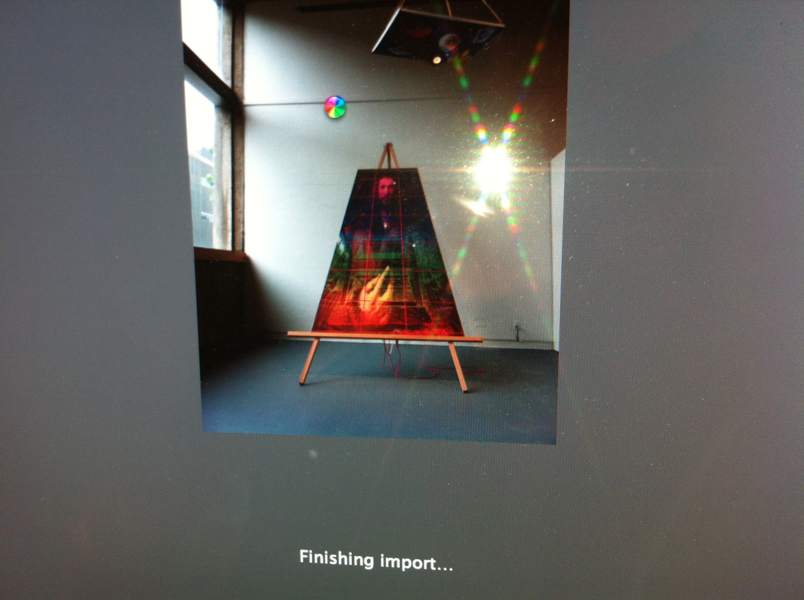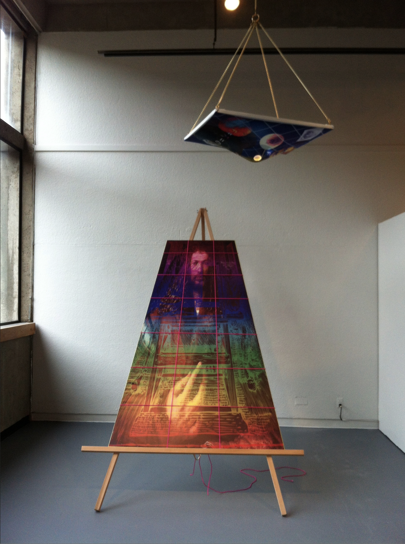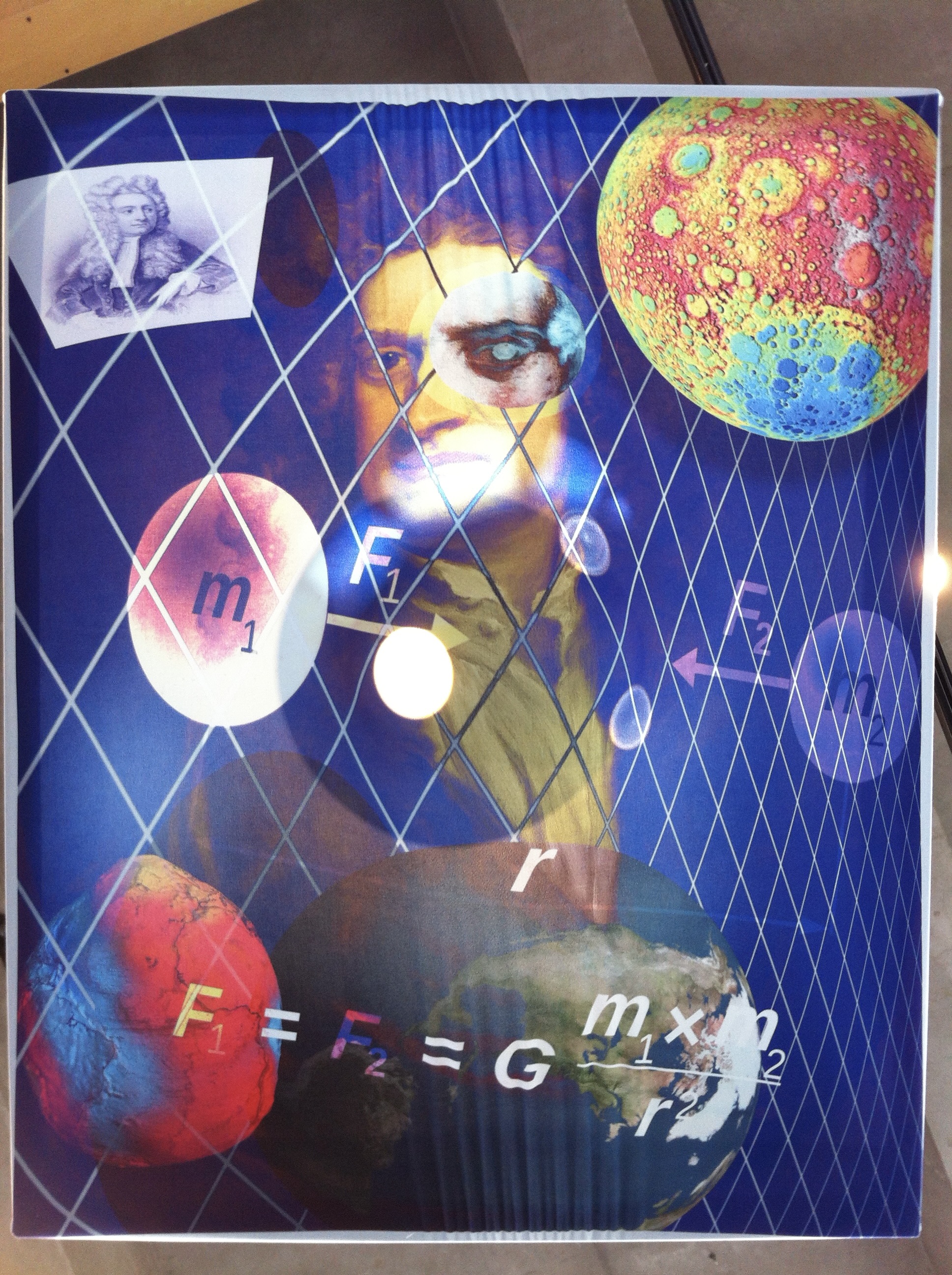 <The second sculptured image hangs from chains from the ceiling. A digital collage with images of Sir Isaac Newton and his equations about gravity are printed on shiny bathing suit material, stretched over a wooden canvas frame. The image is weighed down and stretched by a large crystal ball that catches the light through the fabric. The viewer is dwarfed by the Durer image and wary of the weight of the Newton image in the physical space of the gallery.